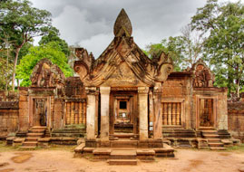 Banteay Srei is built primarily in red sandstone, a medium that lends itself to the elaborate decorative wall carvings which are still observable in fine details today. Measured by the standards of Angkorian construction, the buildings themselves are miniature in scale. These factors have led to its being widely praised as a ‘precious gem’, or the ‘jewel of Khmer art’ and perhaps the temple’s modern name, Banteay Srei or Citadel of Women, is probably related to the intricacy of the bas relief carvings of devatas found on the walls and the tiny dimensions of the buildings themselves.