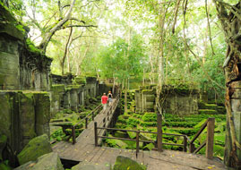 The remains of Boeng Mealea, which are still partly buried under vegetation, consist of perfectly squared-off sandstone building blocks. The outstanding decoration dates from the fist half of the 12th century.