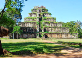 The Koh Ker complex is on the Chhork Koki highland. It was built by King Jayavaraman IV (AD 928-942). Koh Ker temple is 35 meters high, and its design resembles a seven-stepped stupa. The temple faces west toward Angkor city. It was built to worship Treypuvanesvara, the god of happiness.