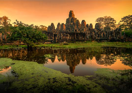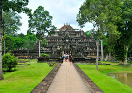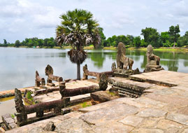 Centered on Baphuon, Angkor Thom is enclosed by a square wall 8m high and 12km in length and encircled by moat 100m wide. The city has five monumental gates, one each in the north, west and south walls and two in the east wall. In front of each gate stand giant statues of 54 gods (to the left of the causeway) and 54 demons (to the right of the causeway), a motif taken from the story of the Churning of the Ocean of Milk illustrated in the famous bas-relief at Angkor Wat. In the center of the walled enclosure are the city’s most important monuments, including the Bayon, the Baphuon, the Royal Enclosure, Phimeanakas and the Terrace of Elephants.