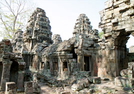 Its structures are contained within two successive enclosure walls, and consist of two concentric galleries from which emerge towers, preceded to the east by a cloister. Like all the other ruins in Angkor, the carvings are captivating.